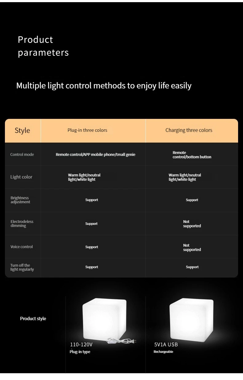 Take complete control over your mood with the included remote. Our Cube Table Lamp offers effortless dimmable LED technology. Easily adjust the brightness to suit reading, relaxing, or entertaining guests. Cover a substantial area—up to 30 square meters—with soft, energy-efficient light. You save on energy bills while enjoying beautiful, consistent illumination. The durable, rotationally molded PVC material ensures a safe, high-quality, long-lasting investment with a three-year warranty.